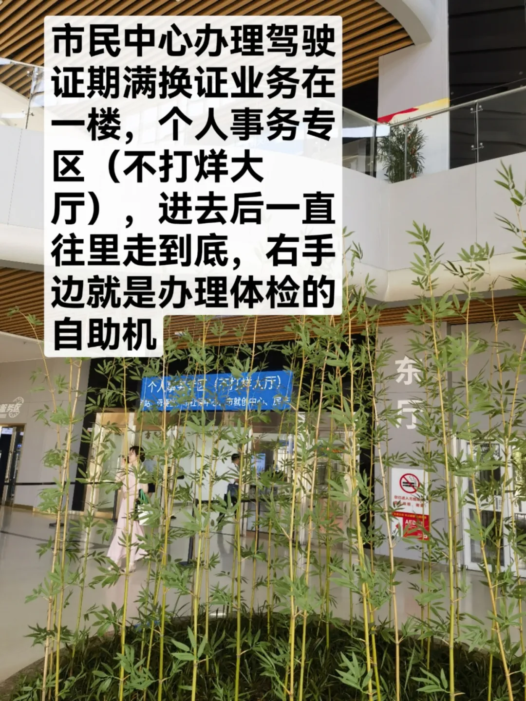 驾驶证换领属于交管业务,交管业务位于南昌市市民中心的东厅一楼,门口有一块“个人事务专区(不打烊大厅)”,进去后,一直走到底,尽头处右拐,就是驾驶证体检办理自助机的地方。